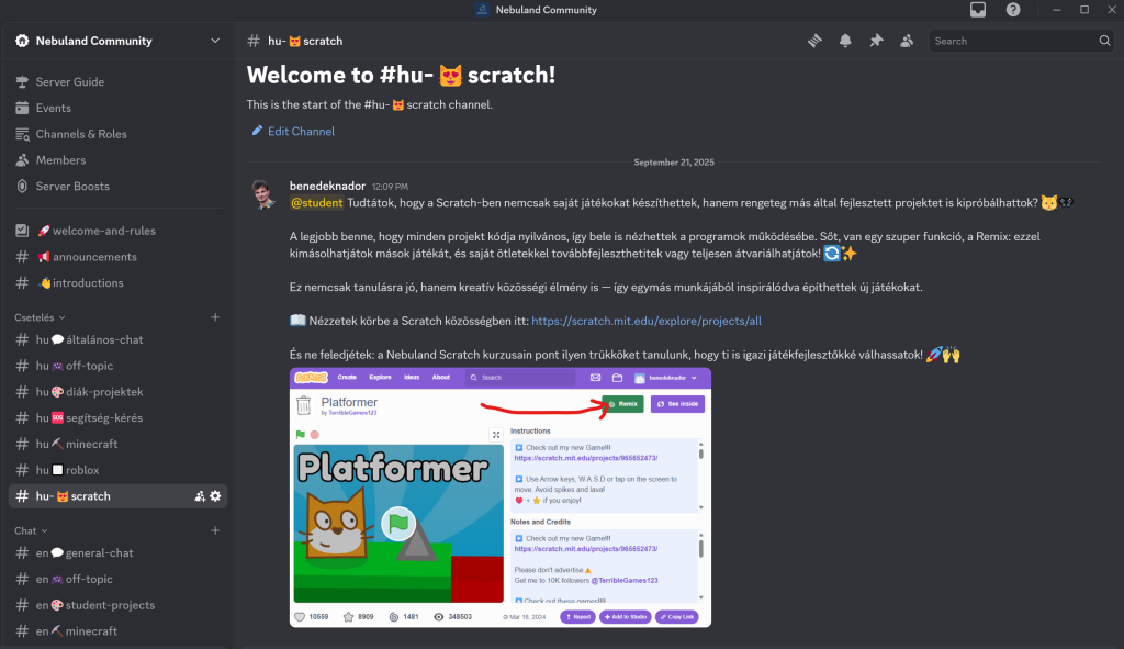 A szakkörön a gyerekek nem egyedül dolgoznak: közösen oldanak meg feladatokat, inspirálják egymást, és megosztják saját ötleteiket. A közösségi tanulás erősíti az együttműködési készségeket és még élvezetesebbé teszi a programozást. Magánórásainkat sem hagyjuk magukra, a Nebuland Discord szerverén új kihívásokra, barátokra és közösségre lelhetnek.